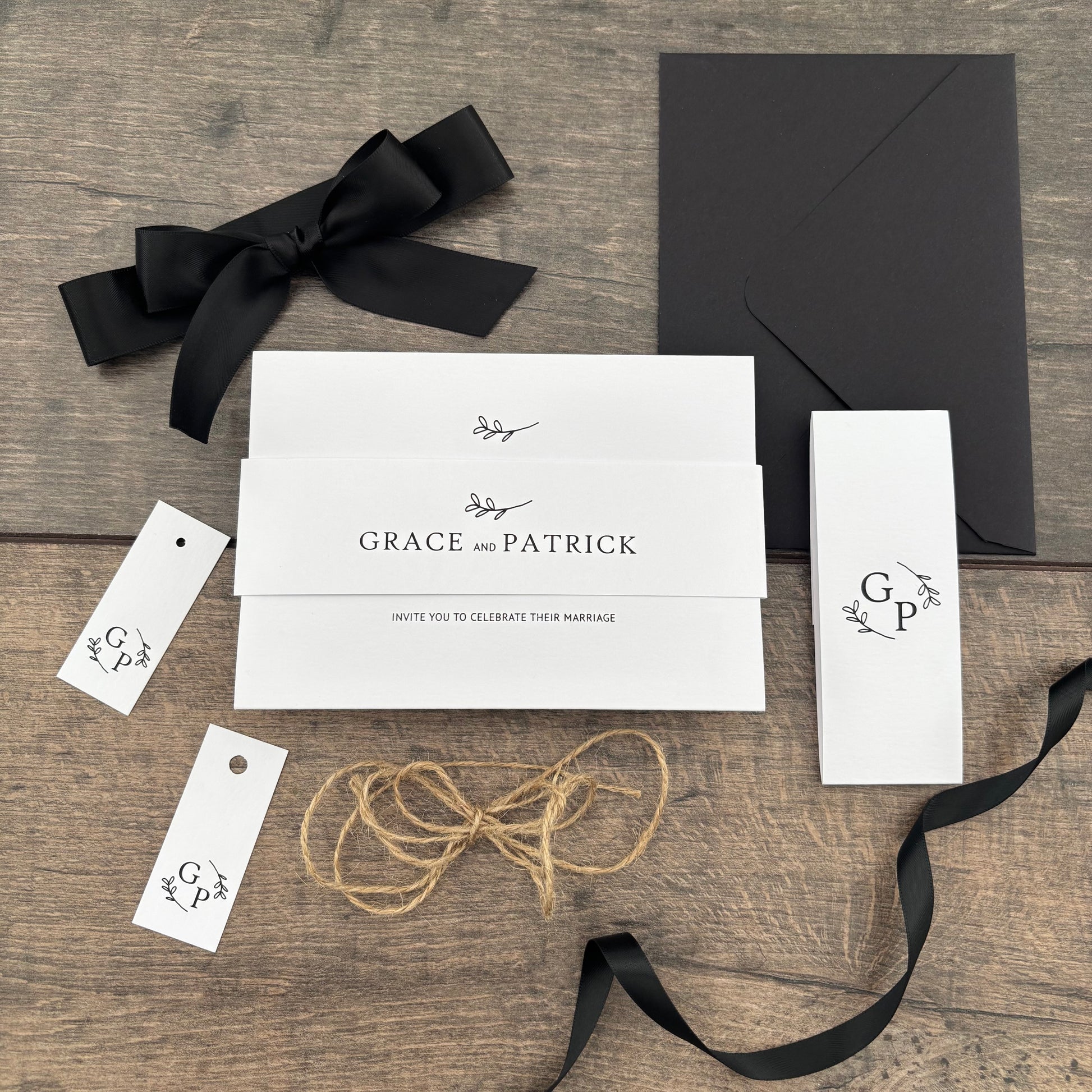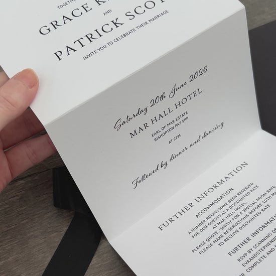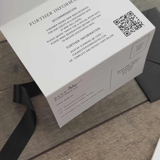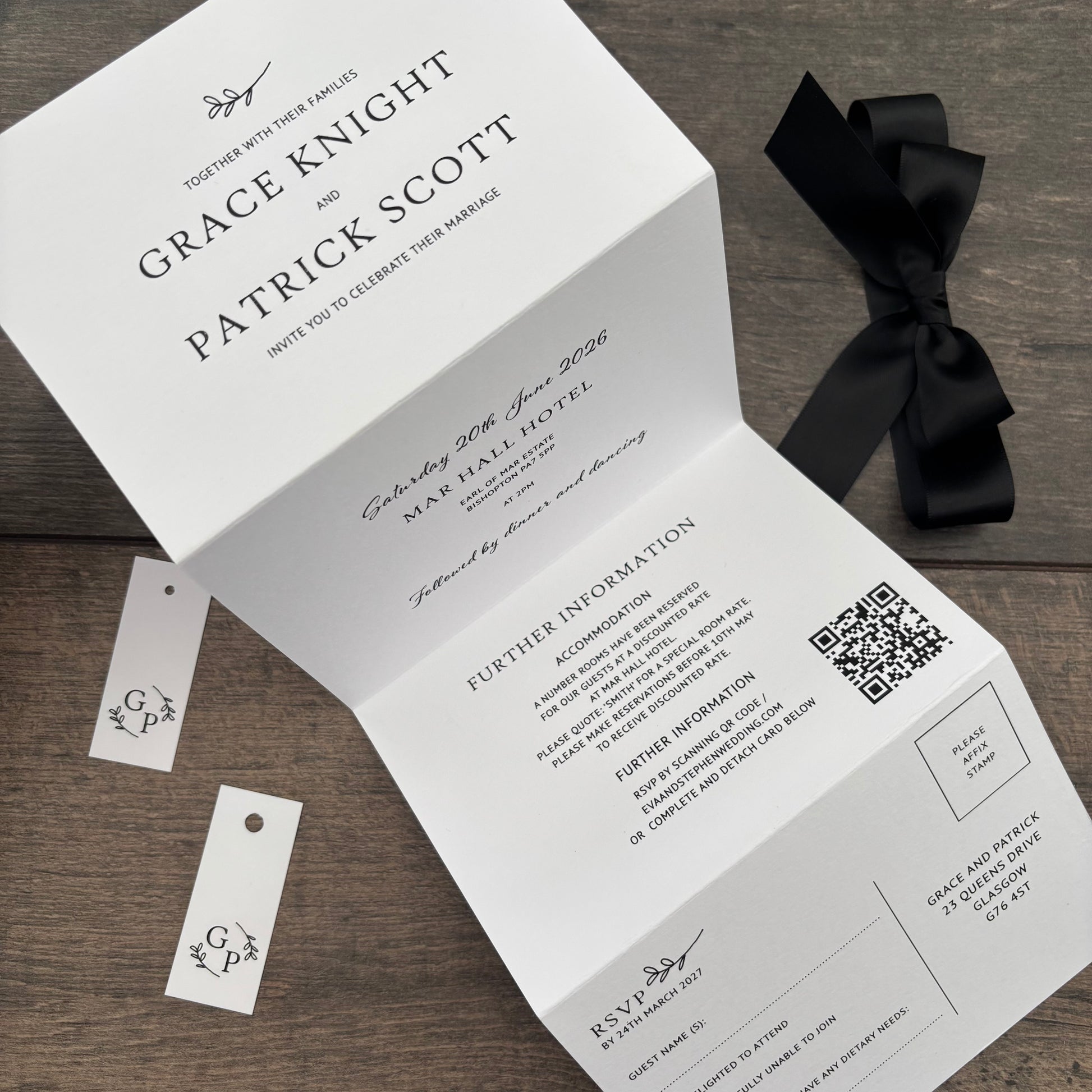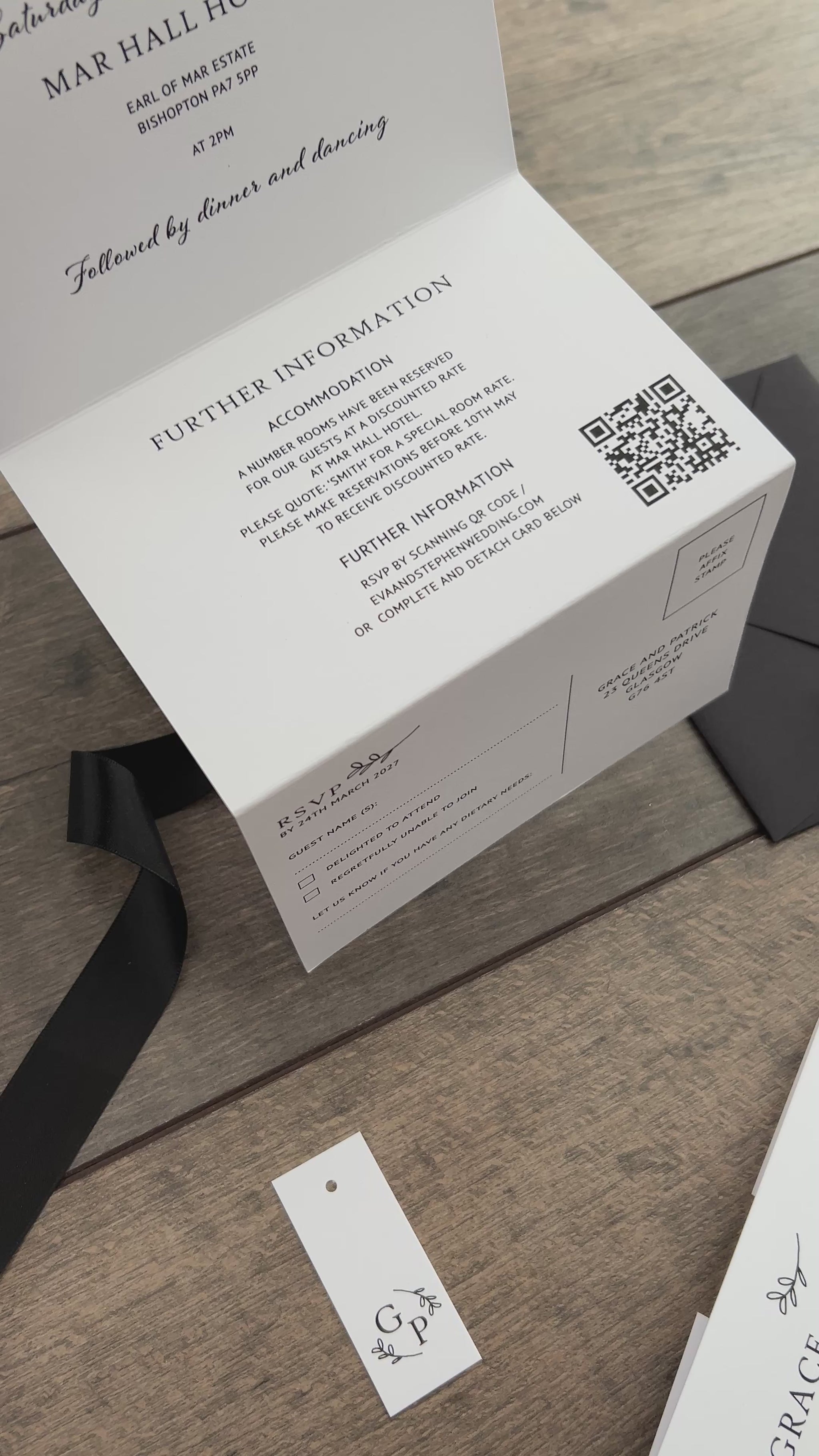Each invitation is fully customisable—you can add a website QR code, and choose matching envelopes. Personalise further with extras like belly bands, tags, and ribbons, all available in colours from our carefully selected palette.