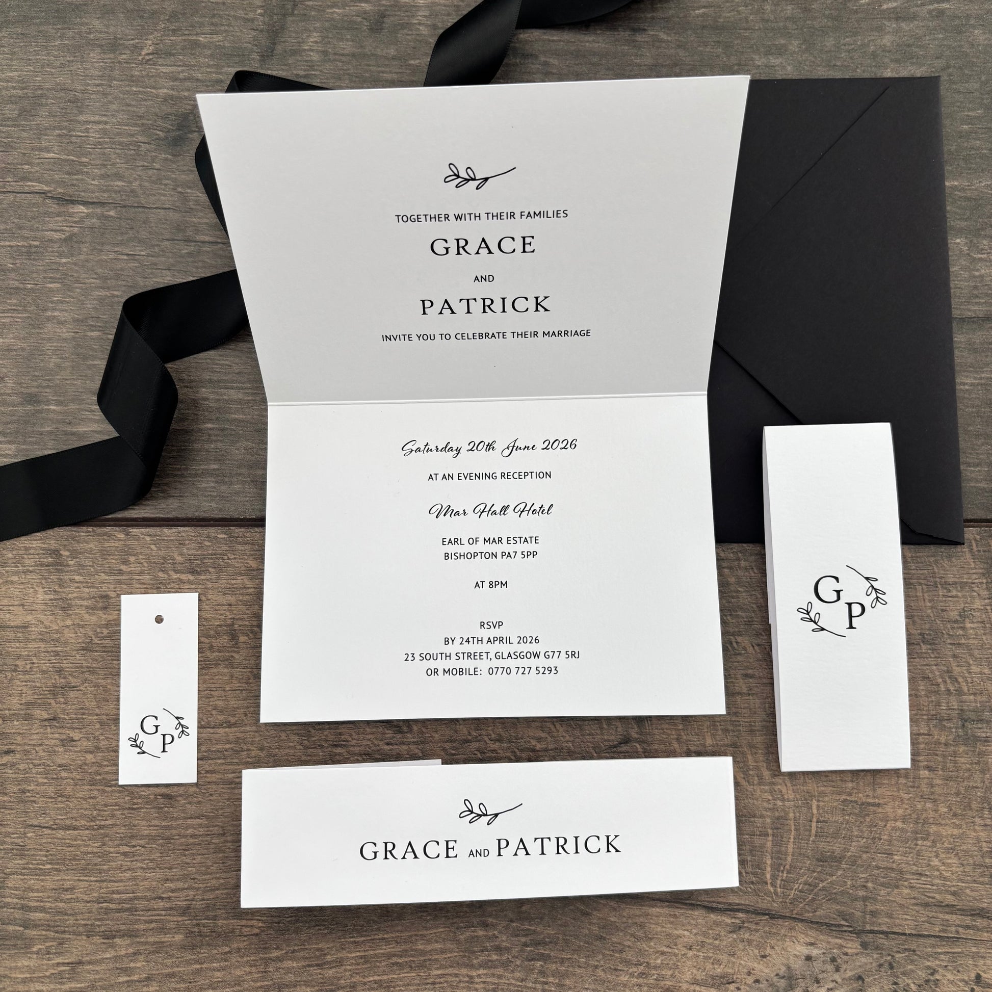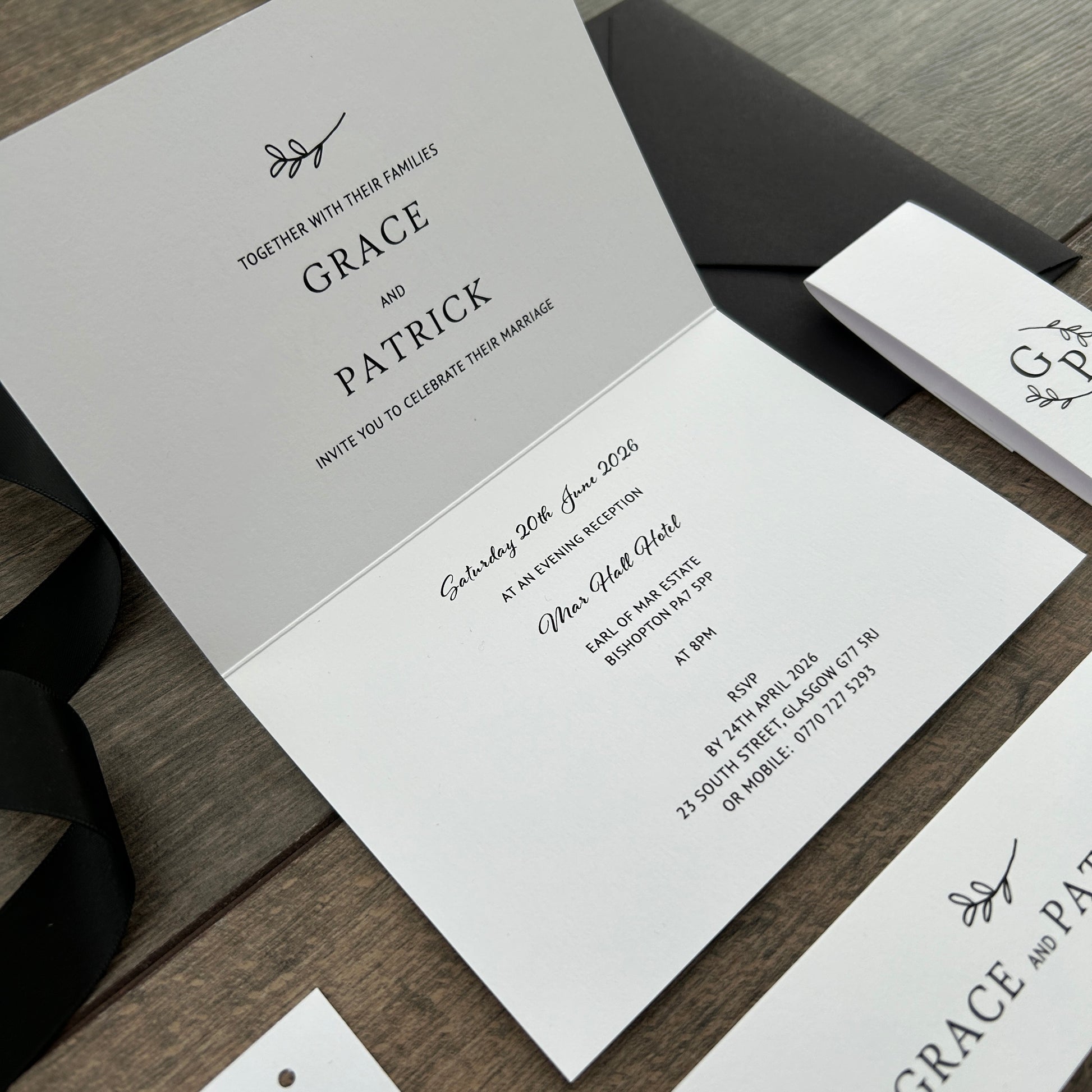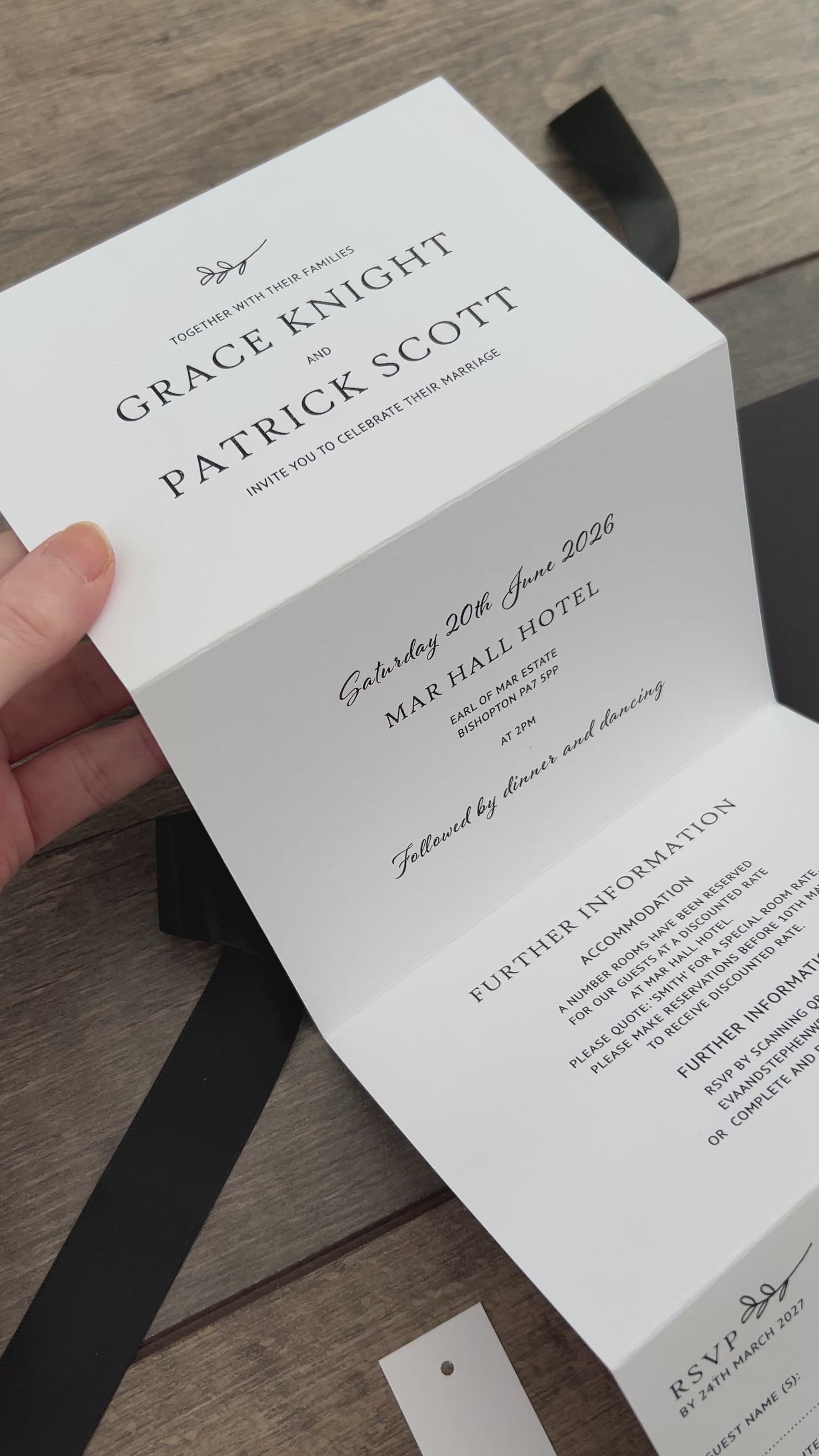 Each invitation is fully customisable—you can add a website QR code, and choose matching envelopes. Personalise further with extras like belly bands, tags, and ribbons, all available in colours from our carefully selected palette.