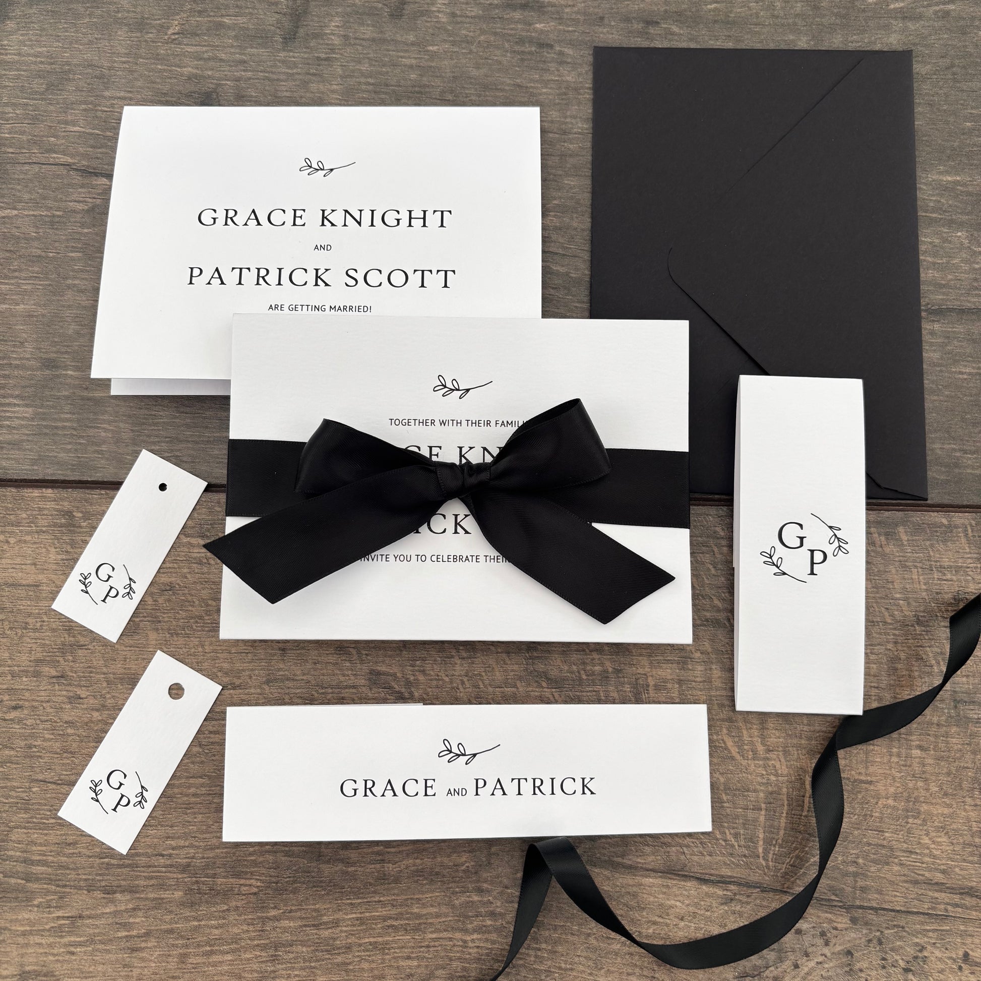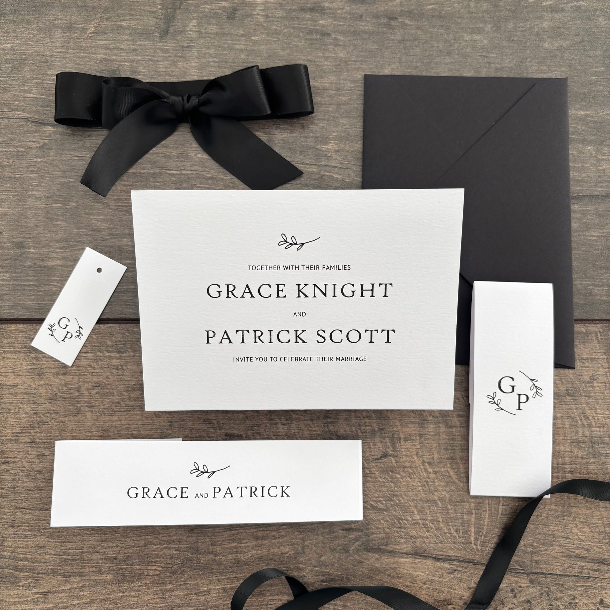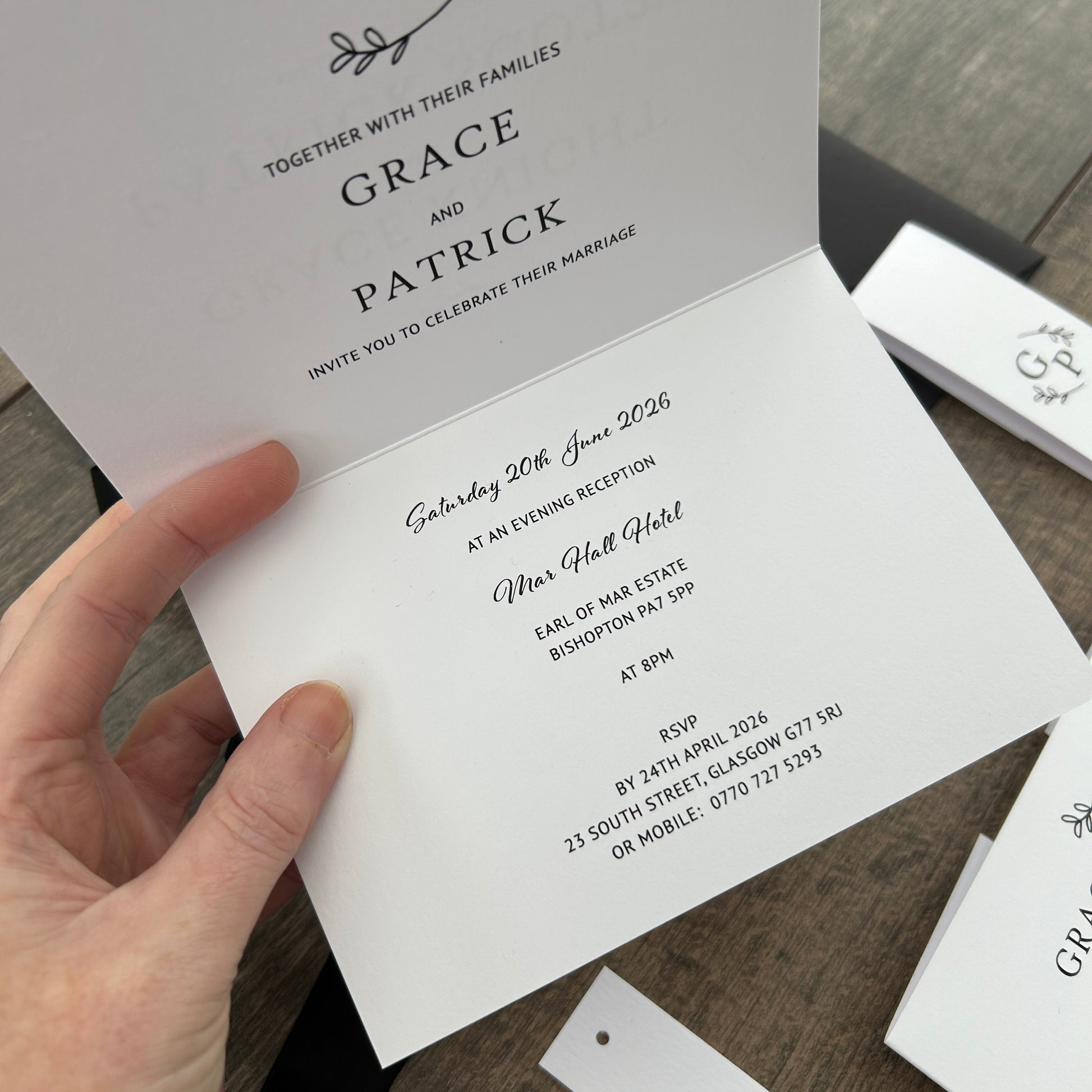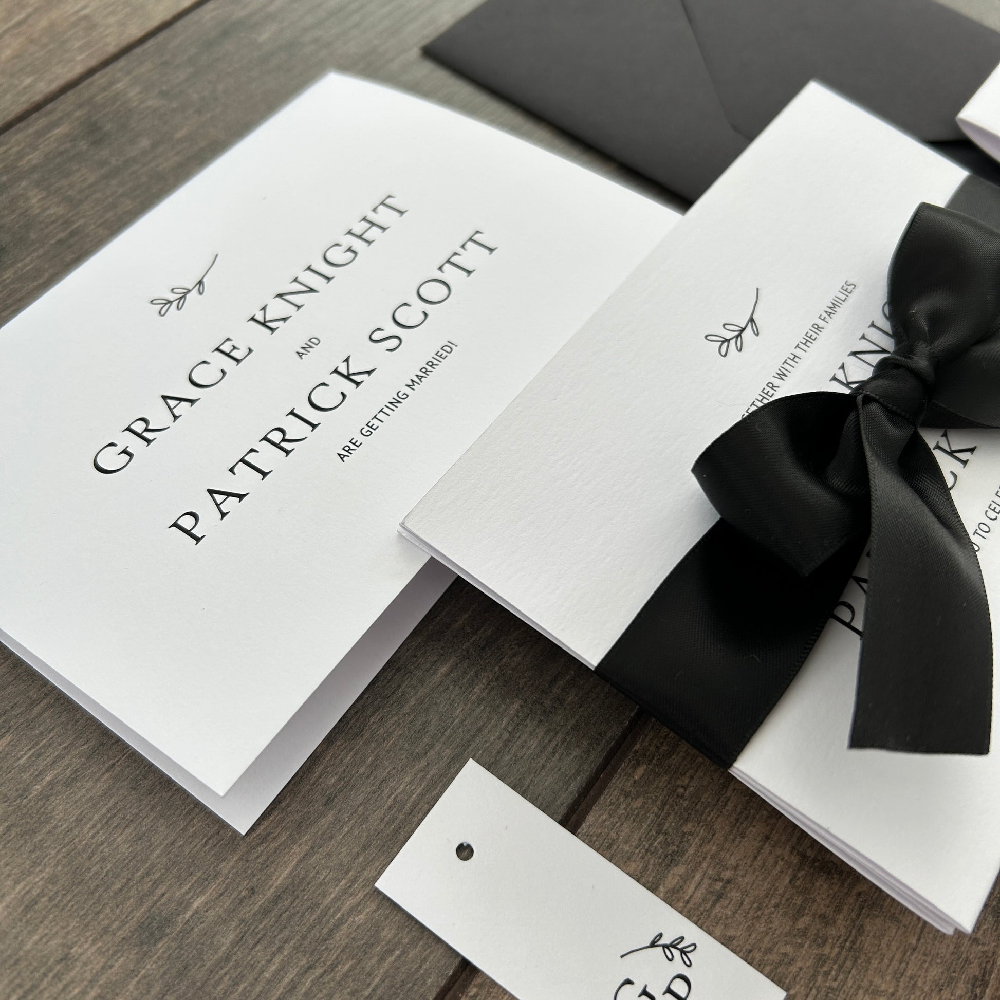 Each invitation is fully customisable—you can add a website QR code, and choose matching envelopes. Personalise further with extras like belly bands, tags, and ribbons, all available in colours from our carefully selected palette.