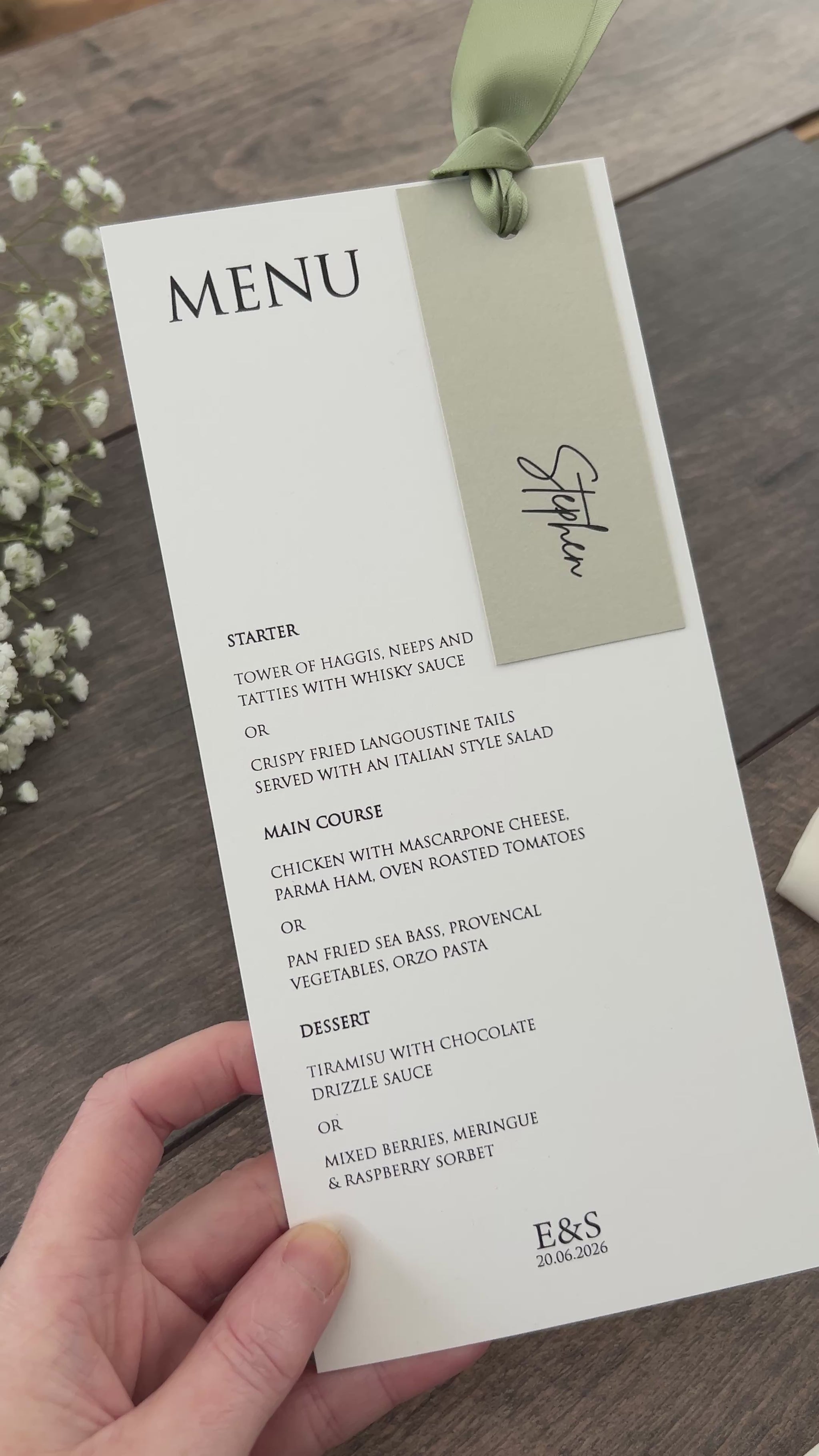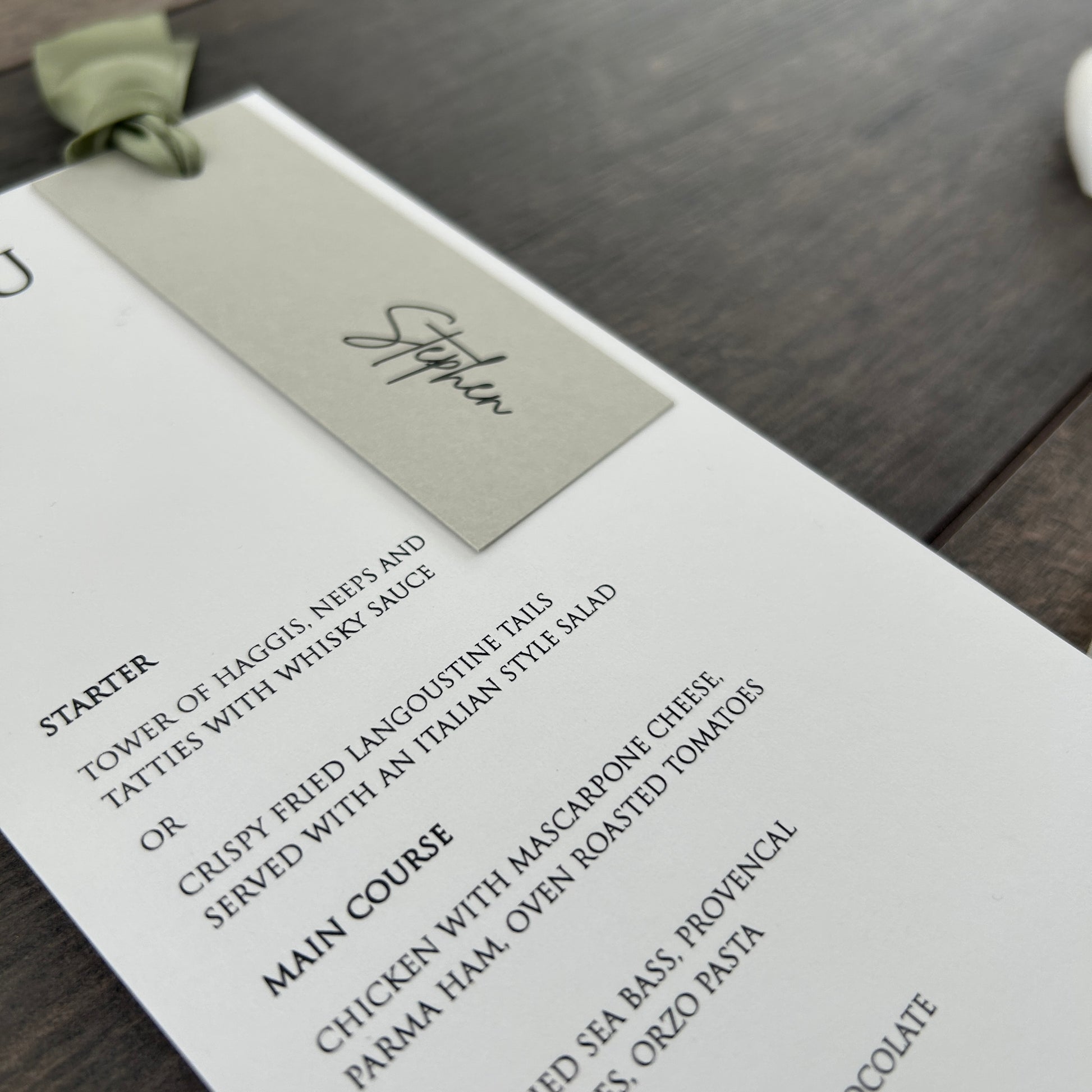 • If you order all items, they’ll arrive neatly packed and ready for you to assemble — simply attach the place cards to the menus and thread through ribbon and tie. If want to order ribbon in one length and cut yourself, ribbon can be ordered from our finishing touches section on website.