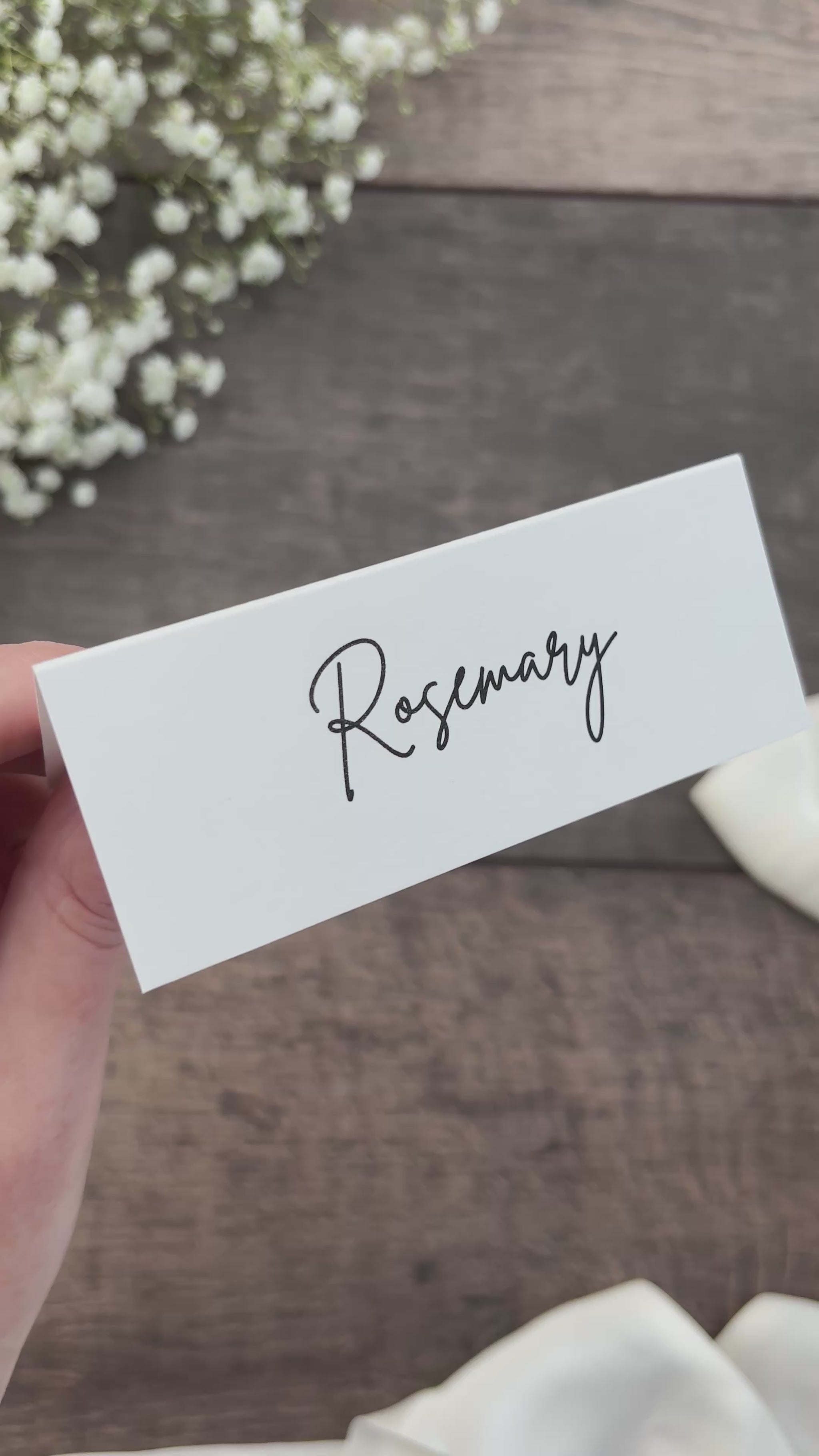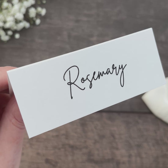 Add a classic and elegant touch to your wedding tables with these folded place cards, printed in crisp black ink on high-quality cardstock. Perfect for displaying your guests’ names with style and ease.