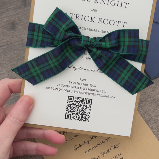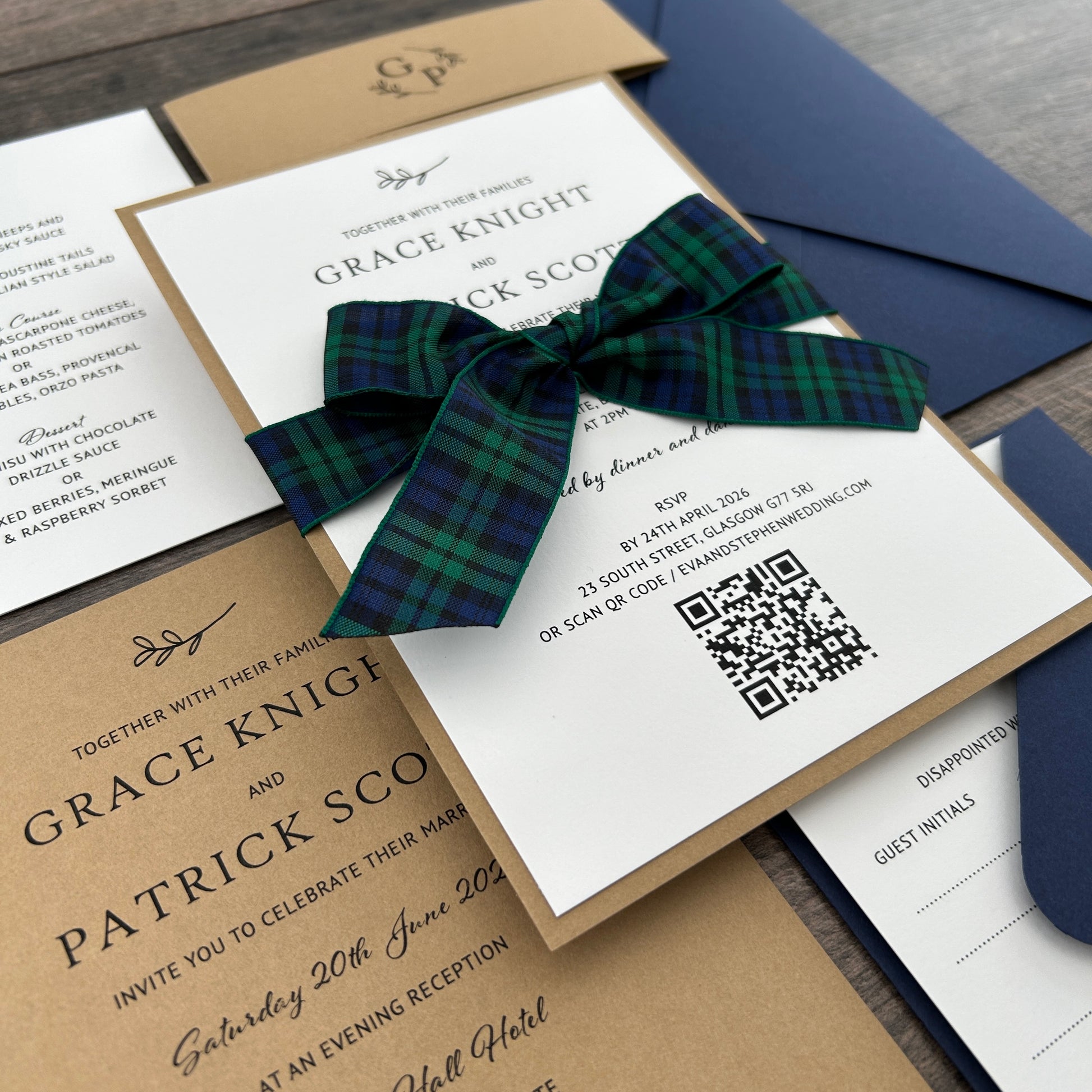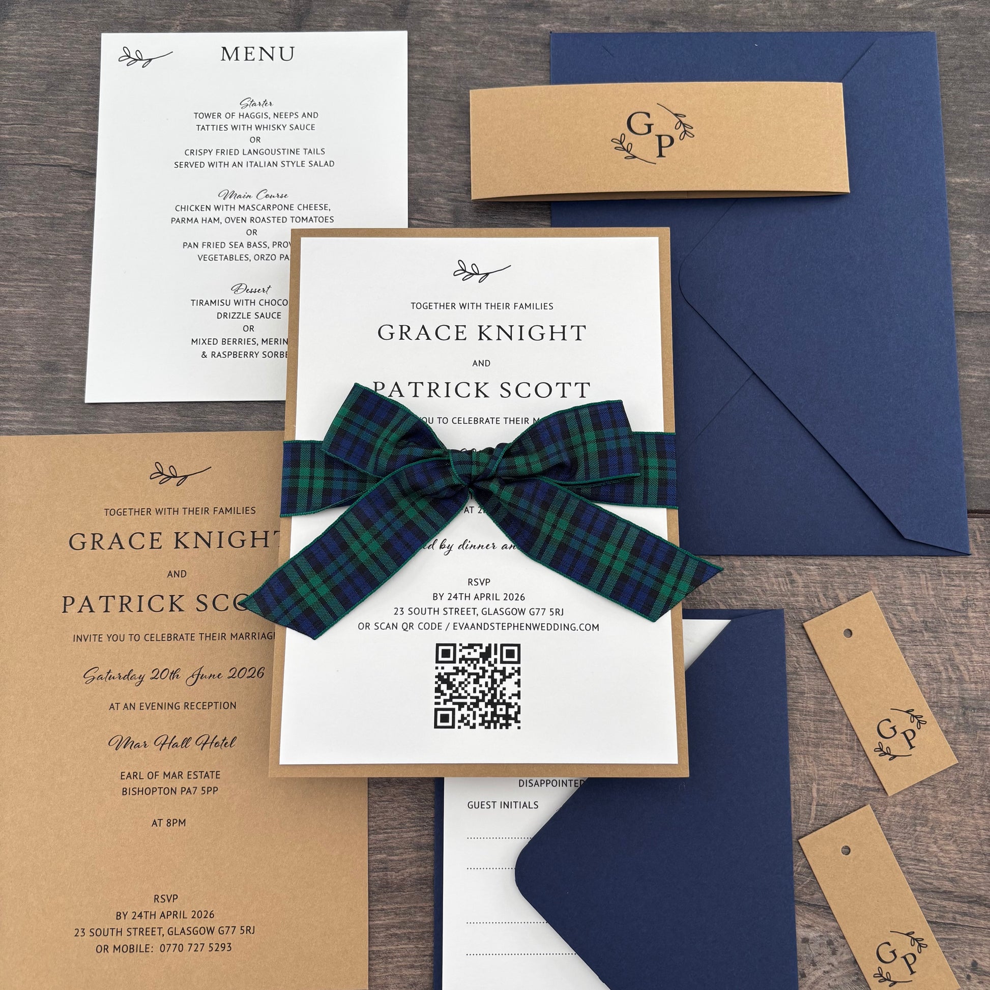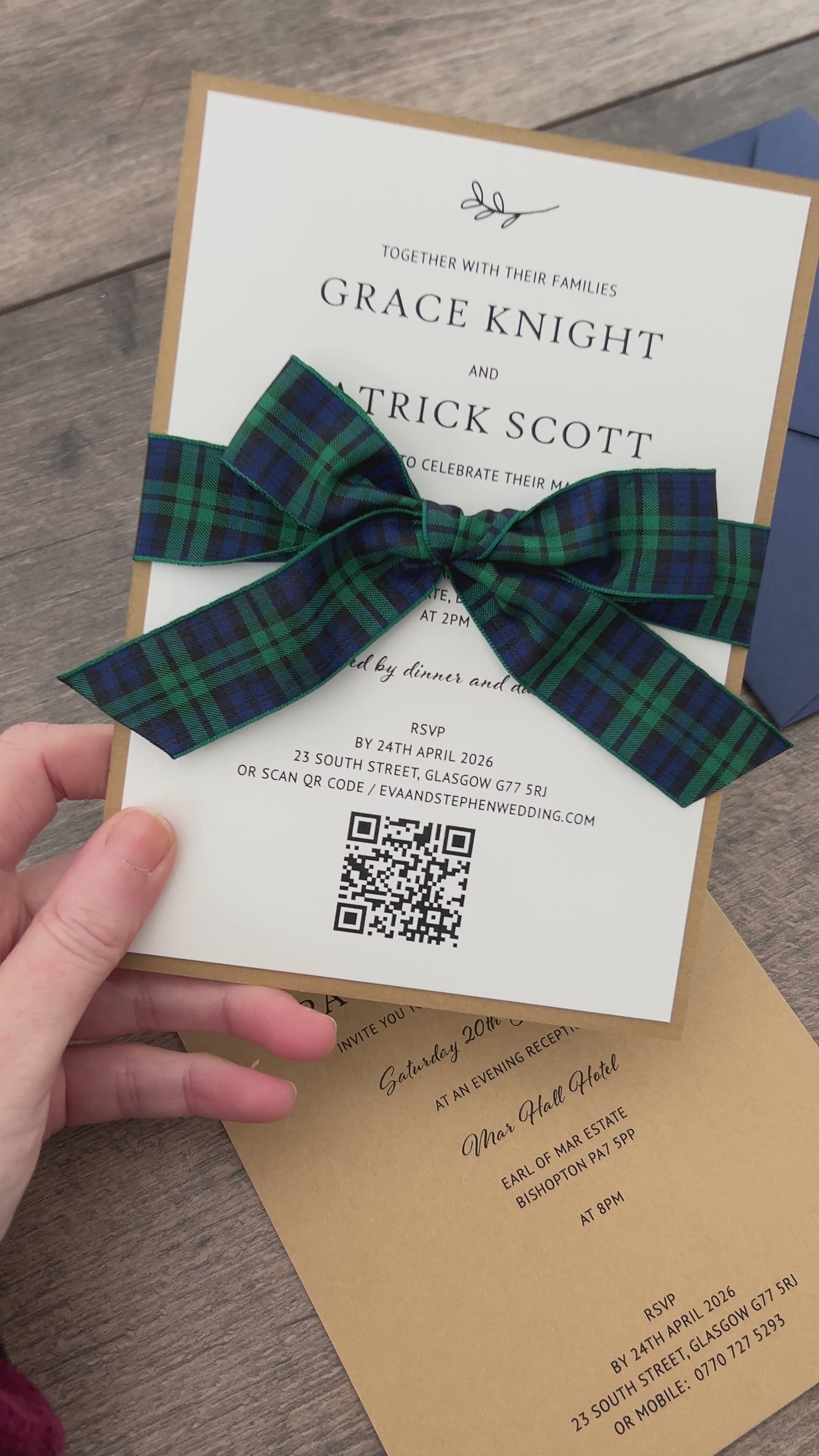 Each invitation is fully customisable—you can add a website QR code, include info and RSVP cards, and choose matching envelopes. Personalise further with extras like belly bands, tags, and ribbons, all available in colours from our carefully selected palette.