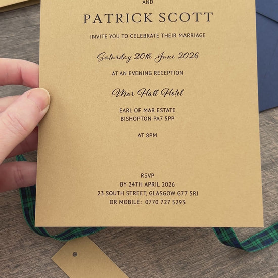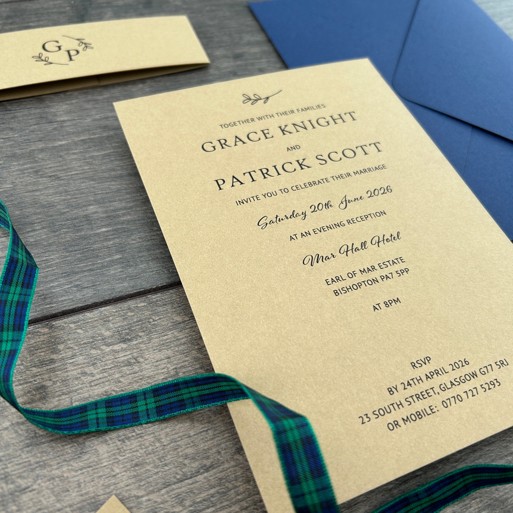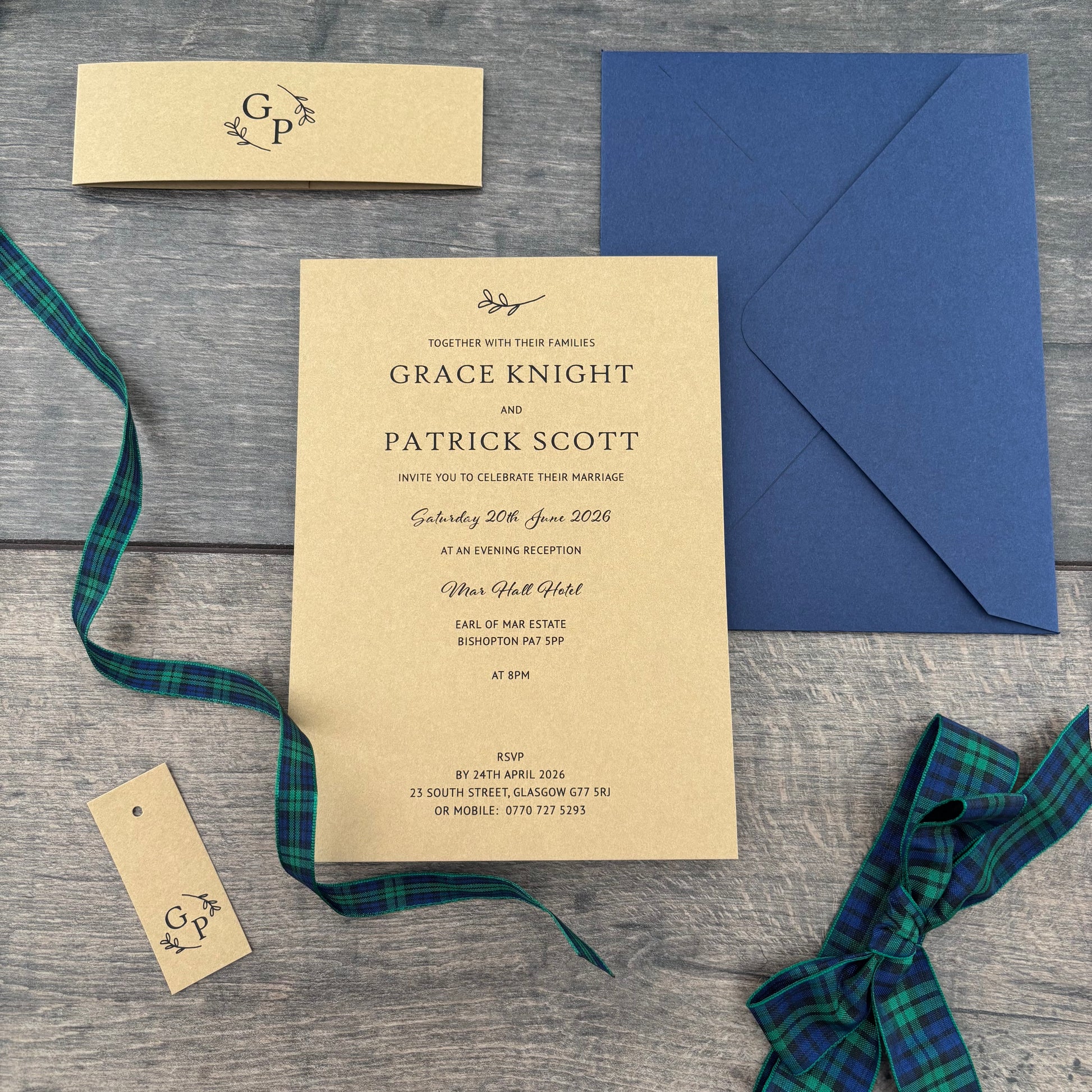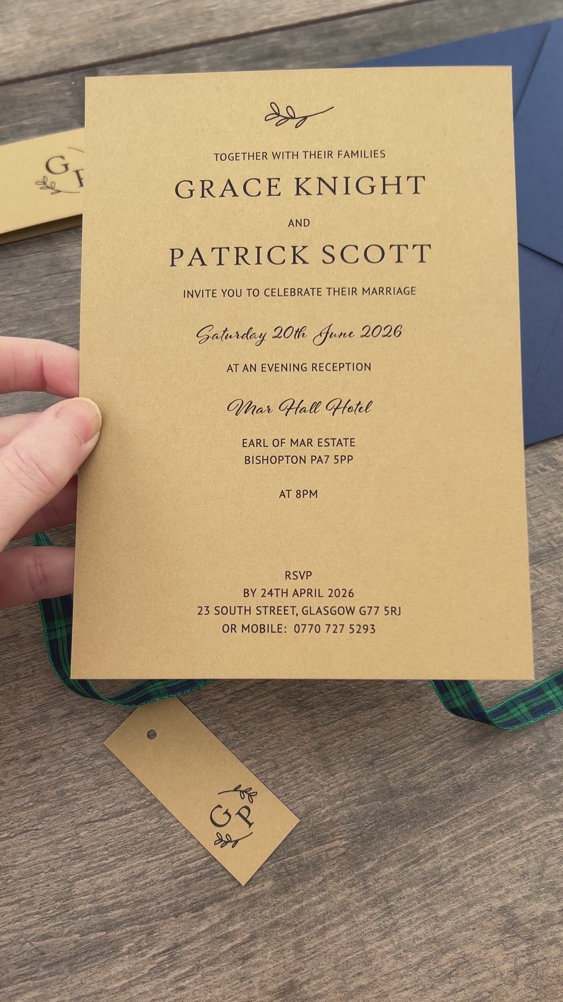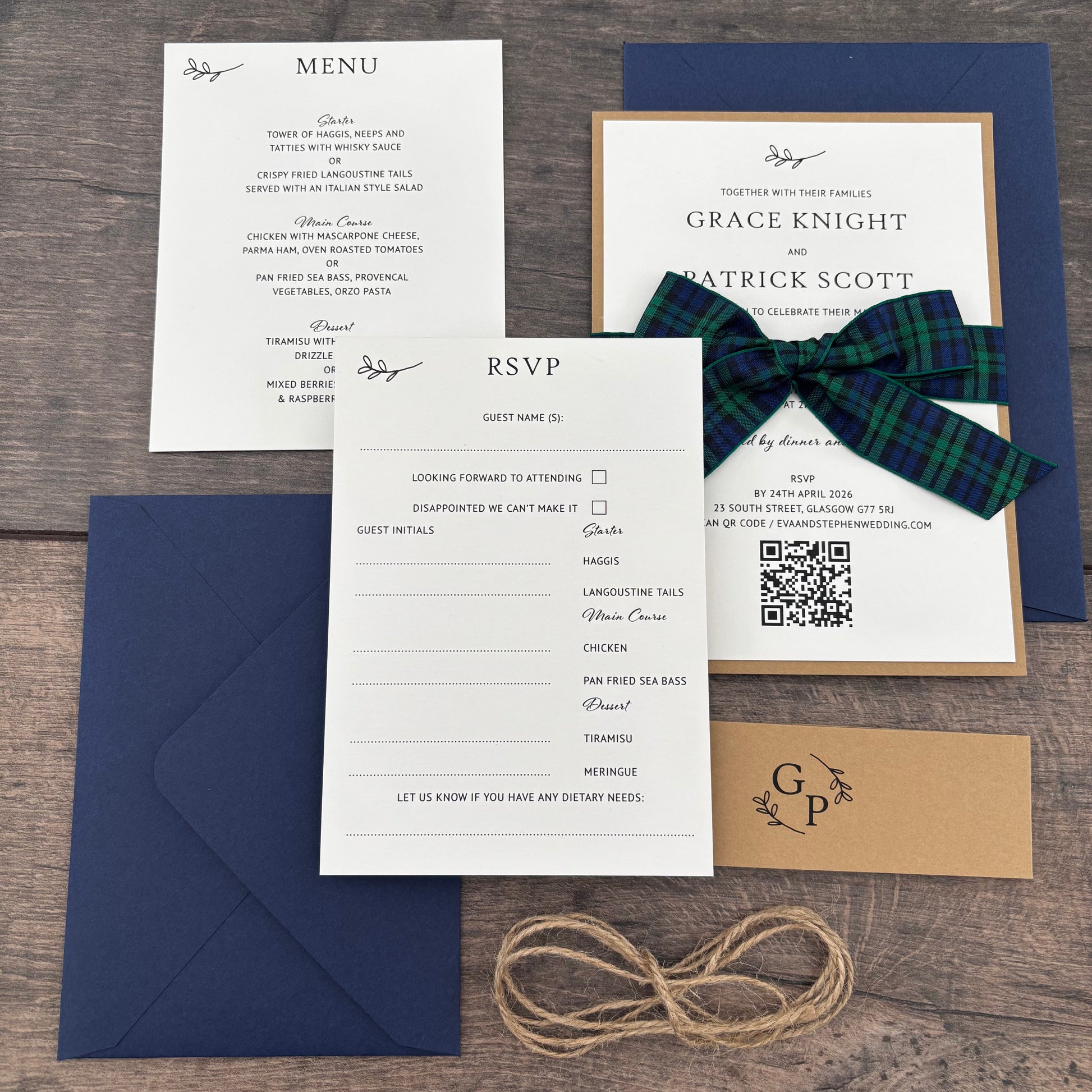 Each invitation is fully customisable—you can add a website QR code, include info and RSVP cards, and choose matching envelopes. Personalise further with extras like belly bands, tags, and ribbons, all available in colours from our carefully selected palette.