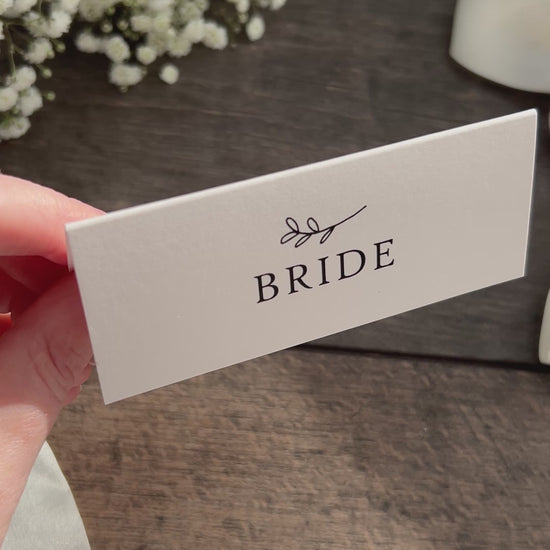 Add a classic and elegant touch to your wedding tables with these folded place cards, printed in crisp black ink on high-quality cardstock. Perfect for displaying your guests’ names with style and ease.