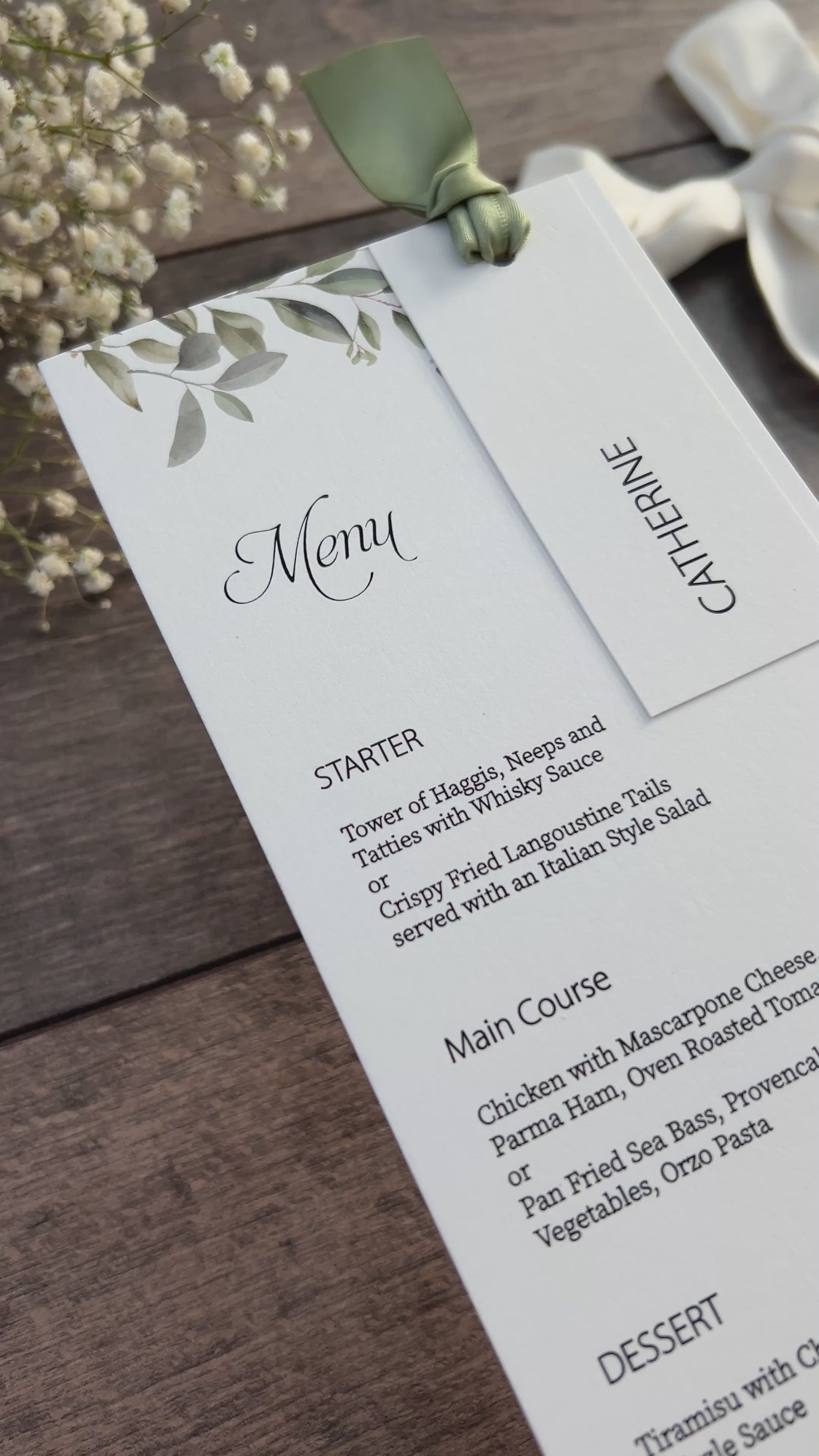 • If you order all items, they’ll arrive neatly packed and ready for you to assemble — simply attach the place cards to the menus and thread through ribbon and tie. If want to order ribbon in one length and cut yourself, ribbon can be ordered from our finishing touches section on website.