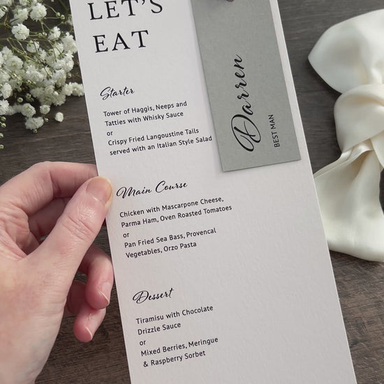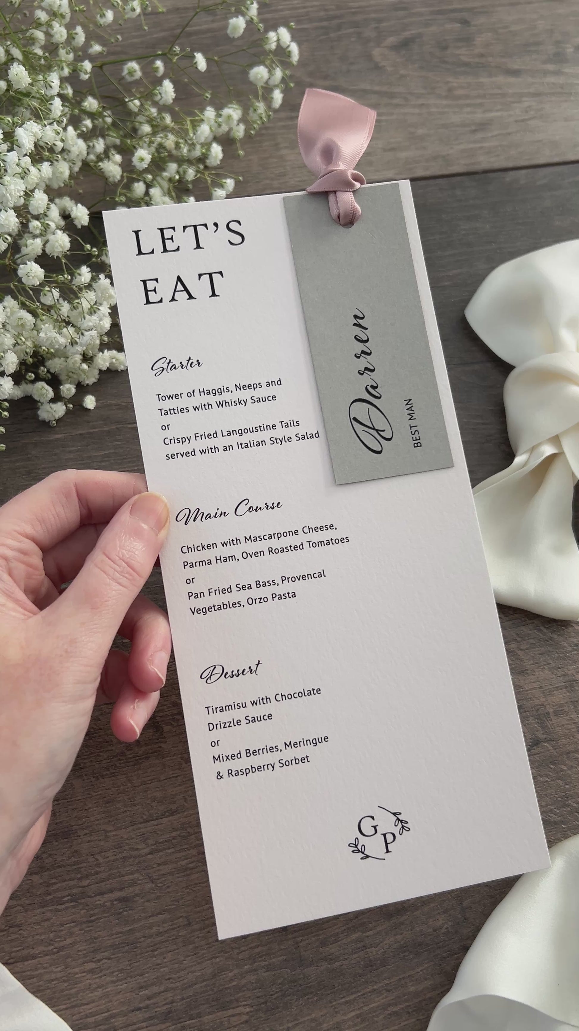 • If you order all items, they’ll arrive neatly packed and ready for you to assemble — simply attach the place cards to the menus and thread through ribbon and tie. If want to order ribbon in one length and cut yourself, ribbon can be ordered from our finishing touches section on website.