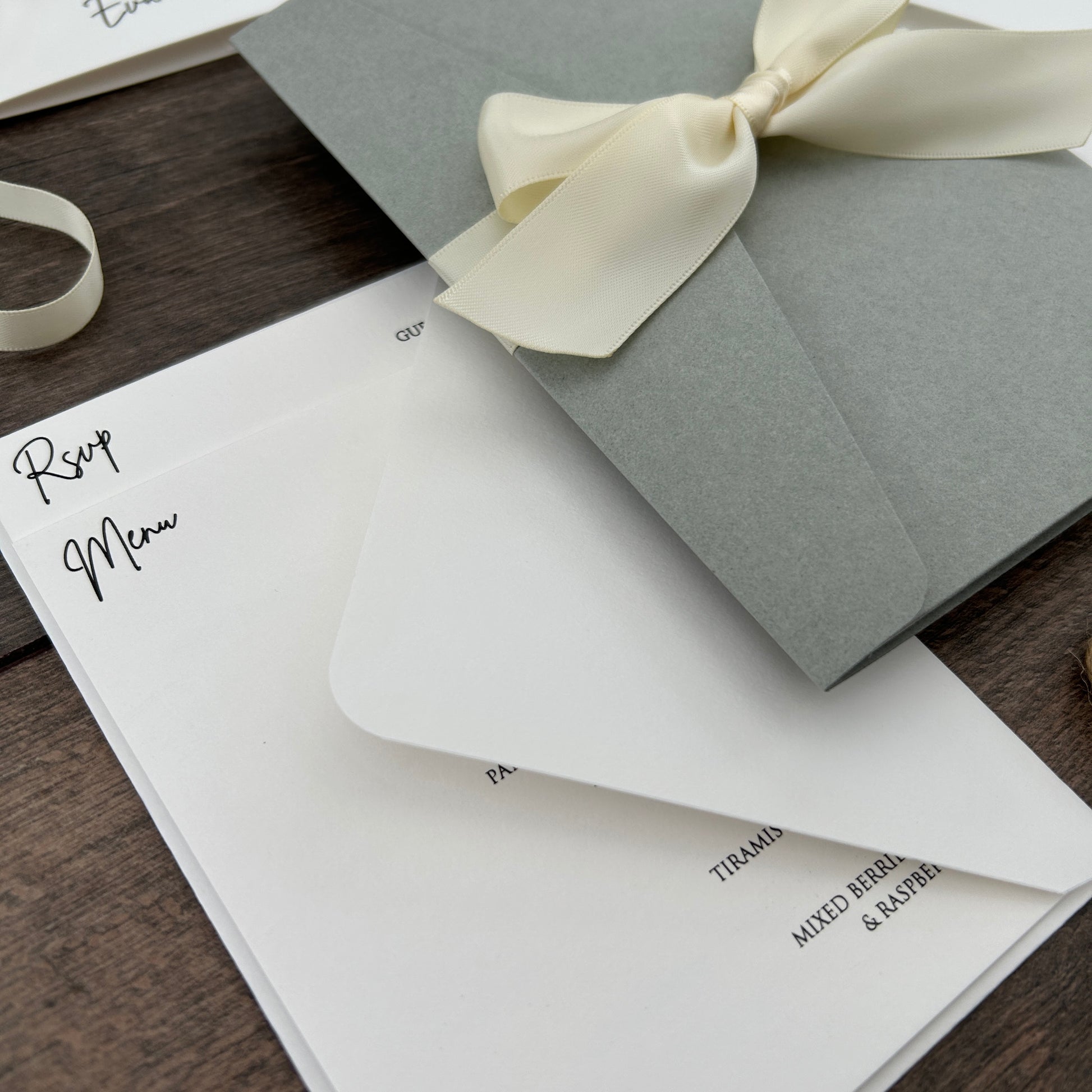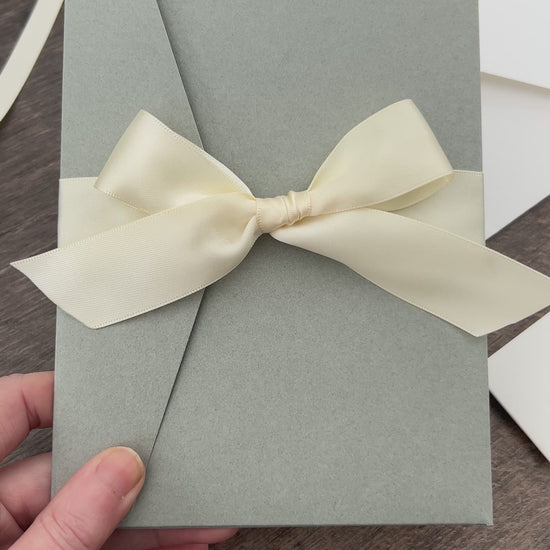♡ Our Grace design in the Pocketfold format opens to reveal your invitation details, with the main card layered in the centre and pocket on the right-side which can hold your RSVP and information cards. This design uses a beautiful handwritten style font. This style is available in four stylish invitation formats: