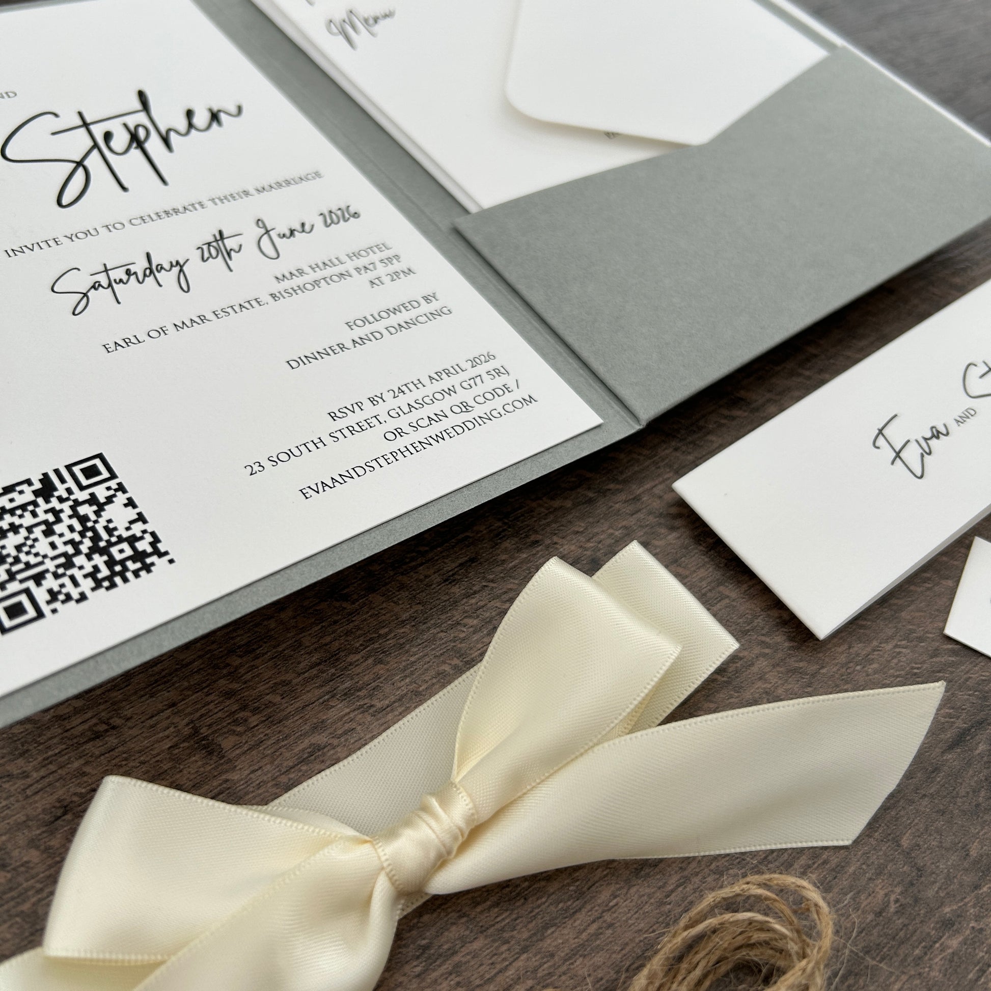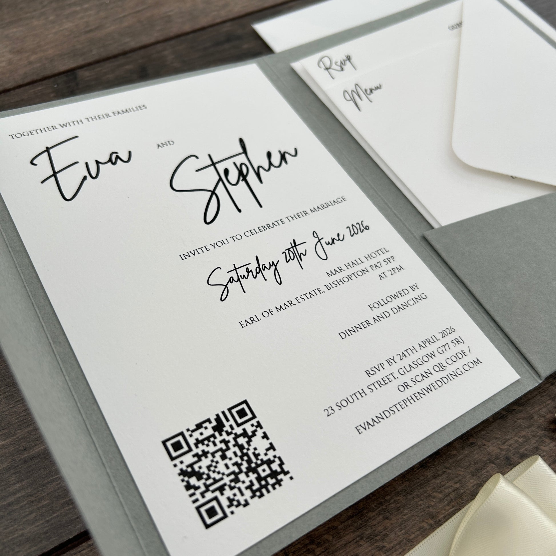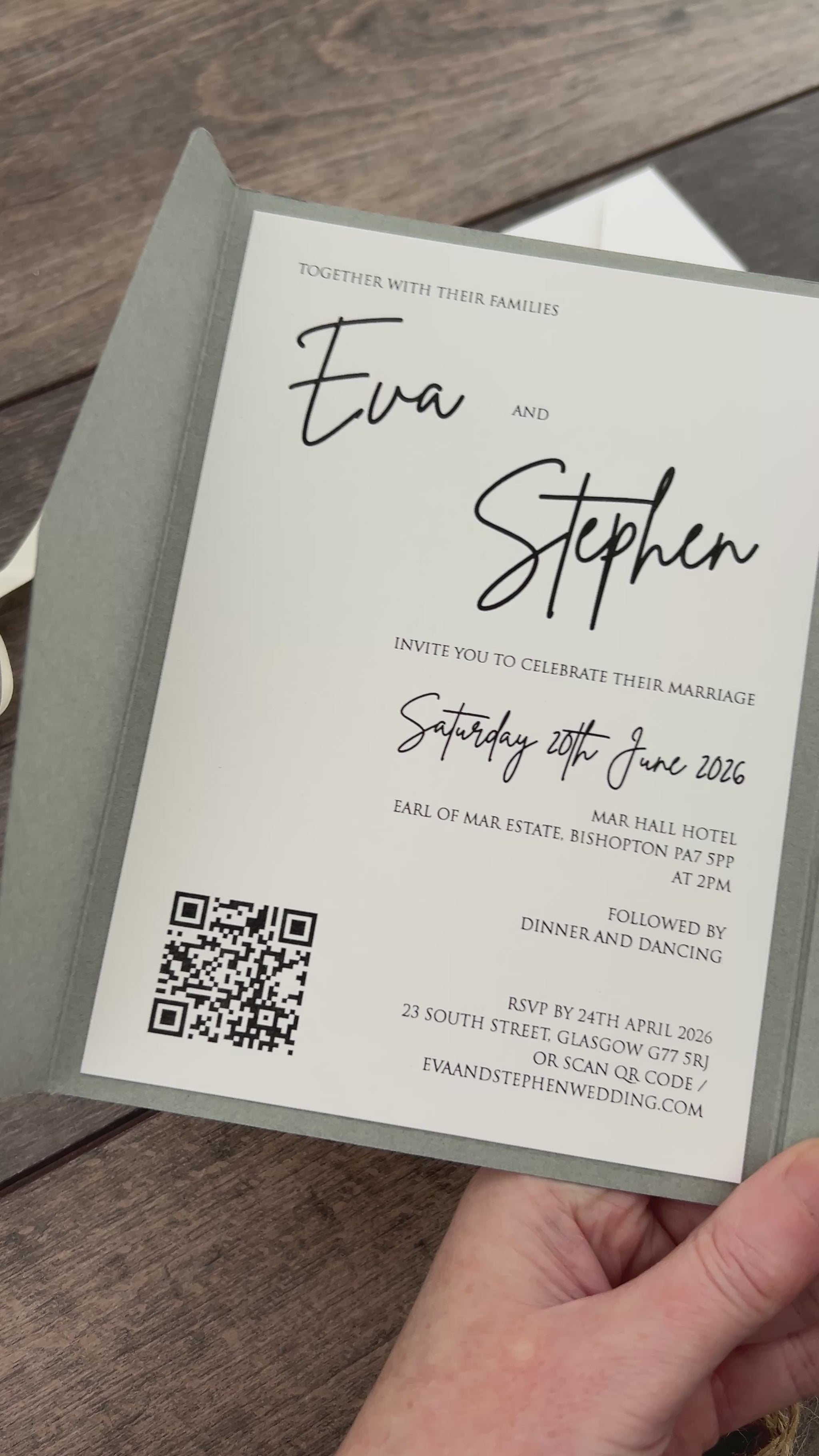 Each invitation is fully customisable—you can add a website QR code, include info and RSVP cards, and choose matching envelopes. Personalise further with extras like belly bands, tags, and ribbons, all available in colours from our carefully selected palette.