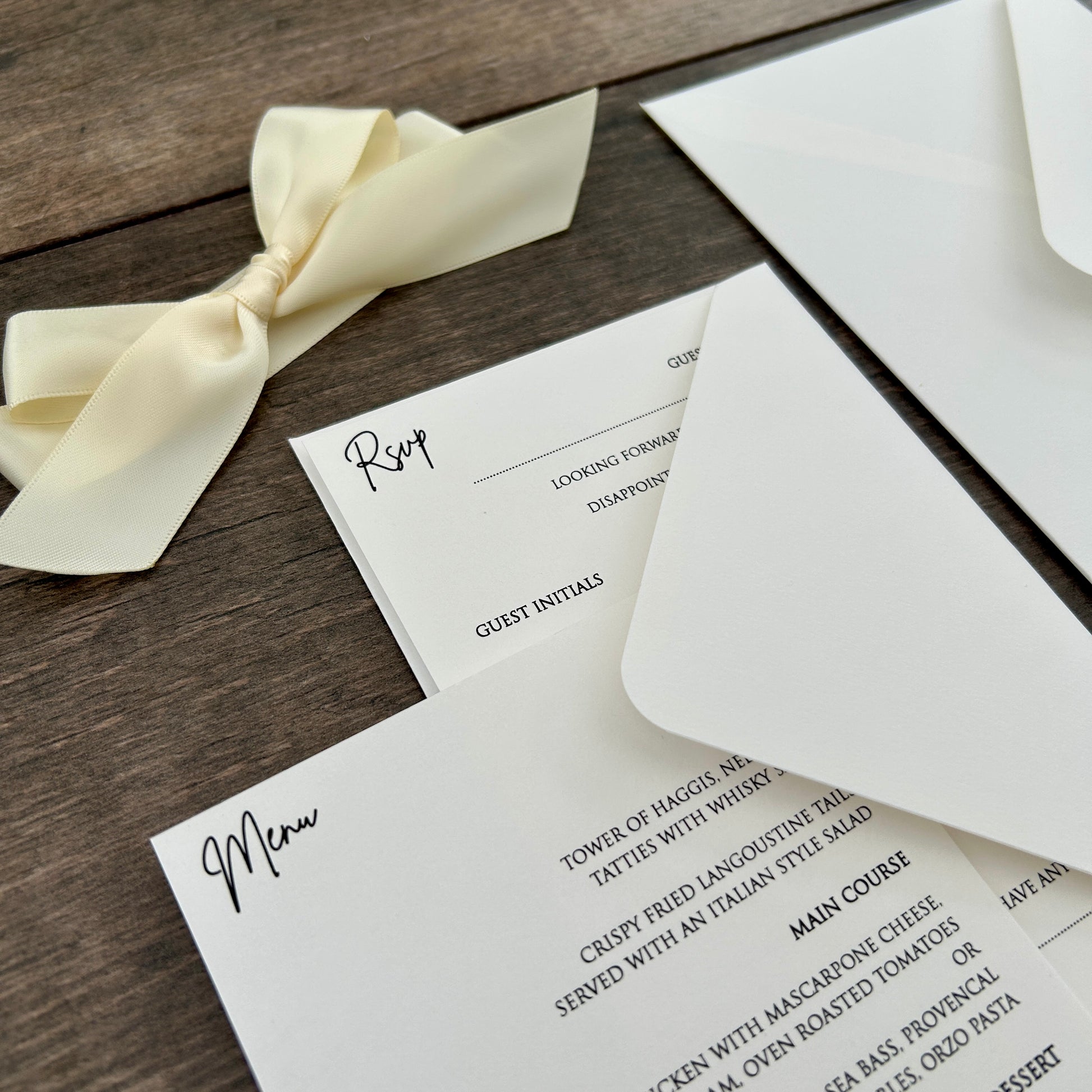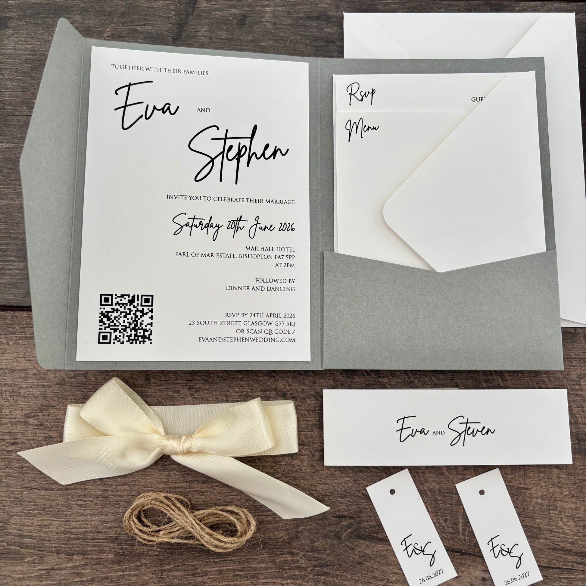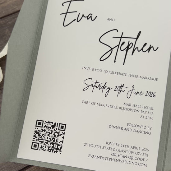 Each invitation is fully customisable—you can add a website QR code, include info and RSVP cards, and choose matching envelopes. Personalise further with extras like belly bands, tags, and ribbons, all available in colours from our carefully selected palette.